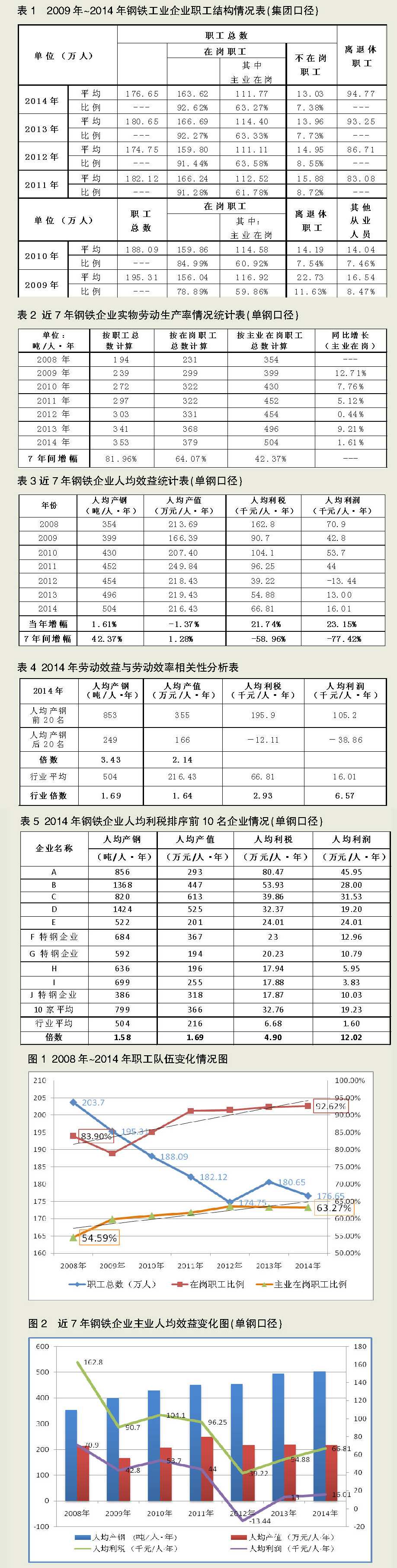 表2顯示,2014年,按單鋼口徑計(jì)算,會(huì)員企業(yè)生產(chǎn)粗鋼總量為5.64億噸,按職工總數(shù)160萬(wàn)人計(jì)算,則人均年產(chǎn)鋼約為353噸;按在崗職工149萬(wàn)人計(jì)算,則人均年產(chǎn)鋼約為379噸;按主業(yè)在崗職工112萬(wàn)人計(jì)算,則人均年產(chǎn)鋼約為504噸。從2008年到2014年的7年間,按職工總數(shù)、在崗職工人數(shù)、主業(yè)在崗職工人數(shù)計(jì)算,實(shí)物勞動(dòng)生產(chǎn)率分別增長(zhǎng)了81.96%、64.07%、42.37%。數(shù)據(jù)充分顯示,鋼鐵行業(yè)人力資源工作者通過(guò)積極的人力資源結(jié)構(gòu)優(yōu)化工作,實(shí)物勞動(dòng)生產(chǎn)率明顯提高。